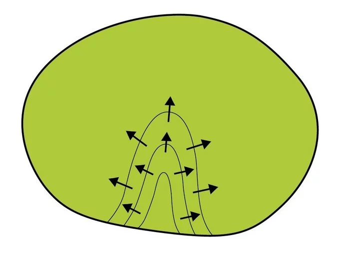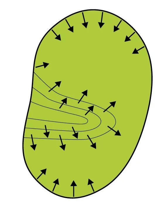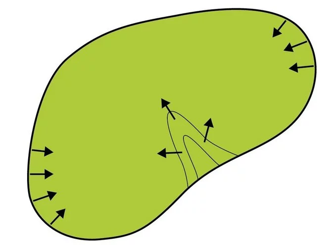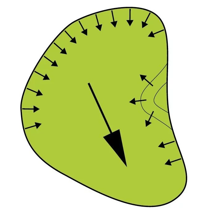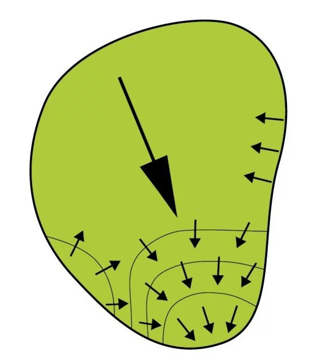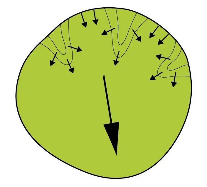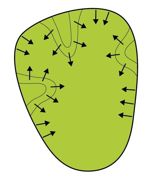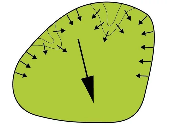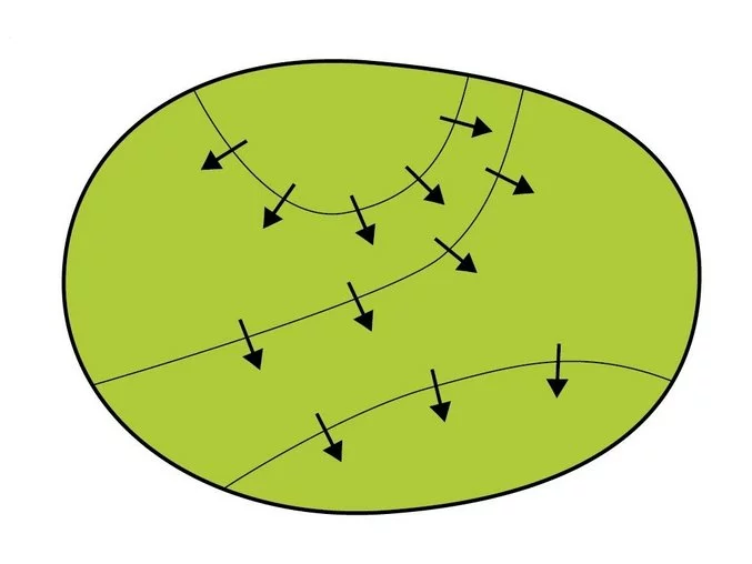 Das Grün neigt sich trichterförmig zur Mitte, zwei Wellen im Grün – eine von links und eine von hinten herein – schirmen eine Fahnenposition links hinten gut ab.