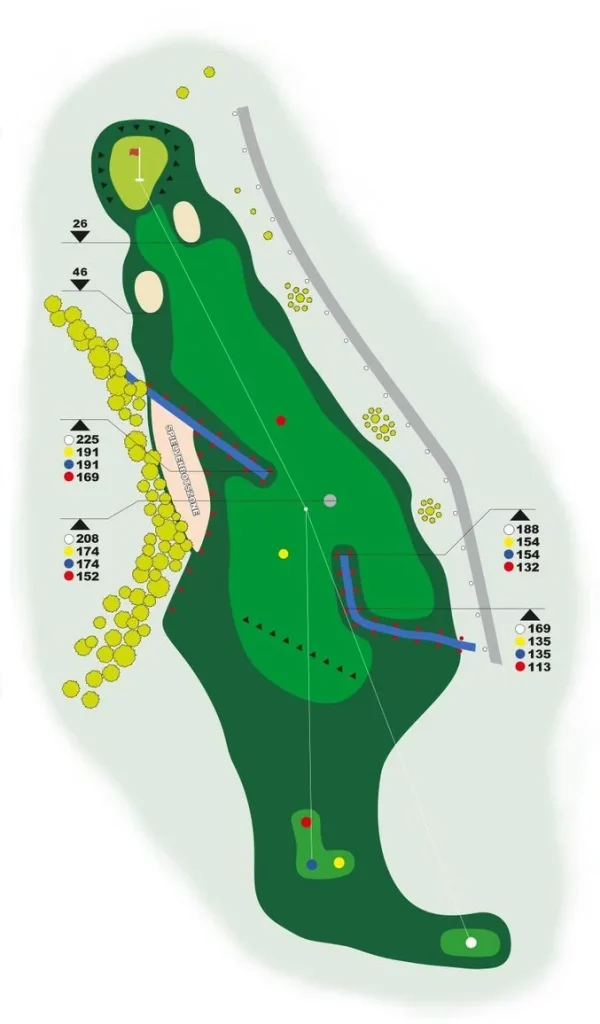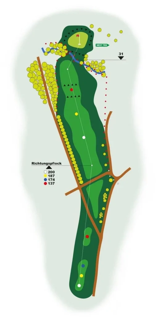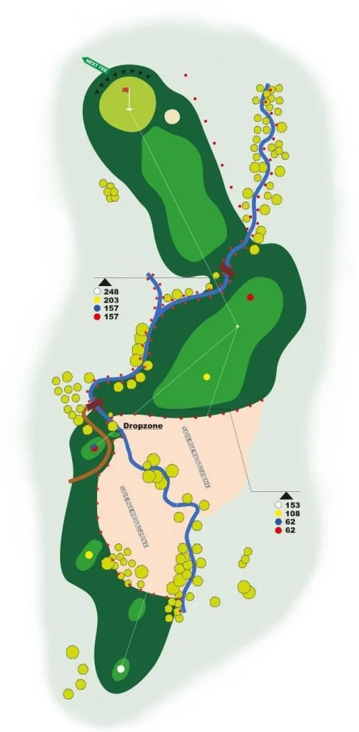 Mit einem langen platzierten Drive auf das Fairway-Plateau kann aus erhöhter Position das Grün gut überblickt und angespielt werden. Doch Vorsicht: Von zu weit links aus kann das Grün nicht mehr eingesehen werden, und zu weit rechts verhindern so manche Bäume und Sträucher entlang des Bachlaufs ein ungehindertes Anspielen des Grüns!
