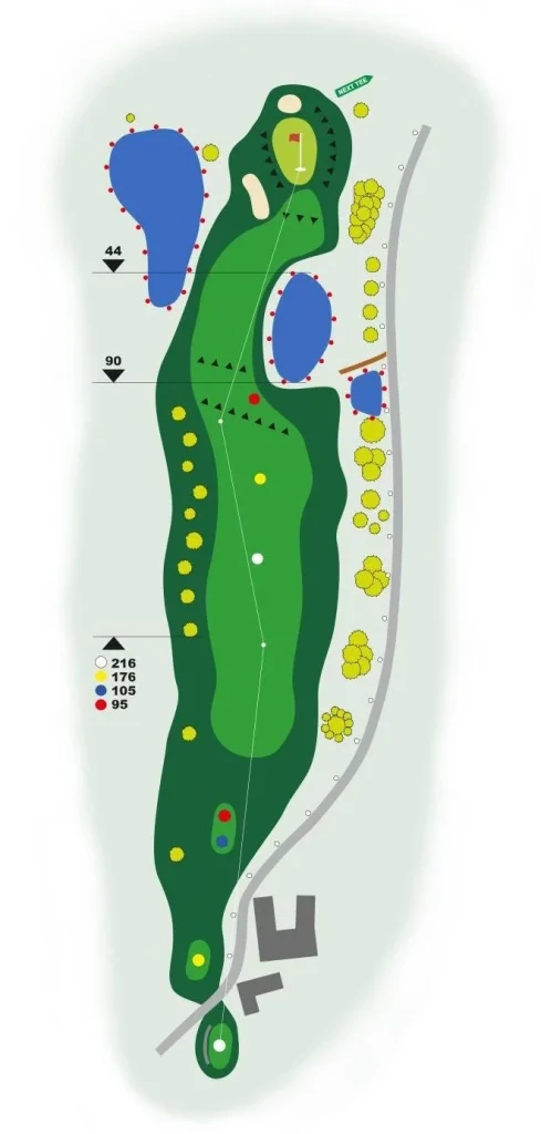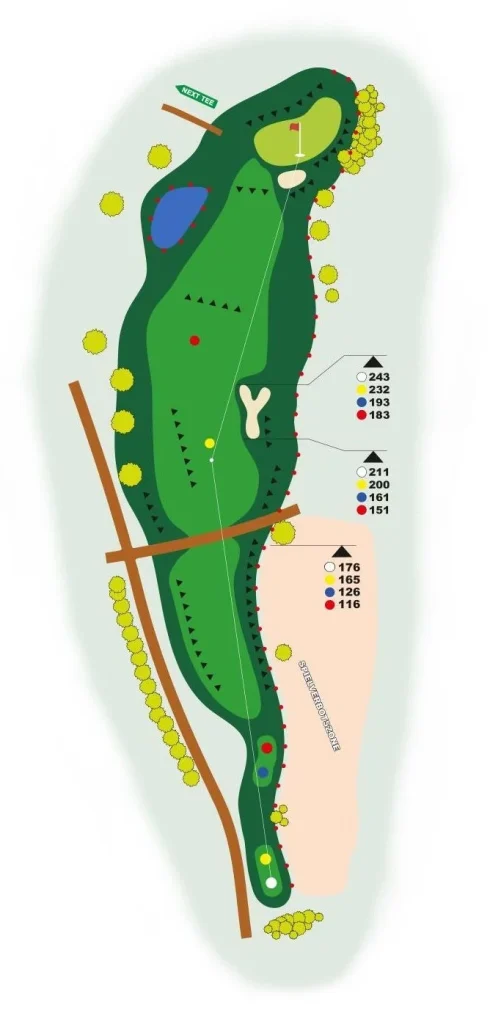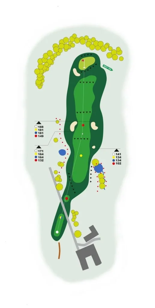 Die Spielbahn des mit zwei Teichen konzipierten Par 4 führt leicht bergab. Ein kontrollierter Abschlag auf die rechte Seite des Fairways ist der bevorzugte Schlag. Das Gelände neigt sich von rechts nach links und fördert einen „Roll“ in Richtung Fairway-Teich. Sollten Sie wider Erwarten mit dem Abschlag in der Wiese rechts landen, denken Sie bitte vor der Suche an einen provisorischen Ball.