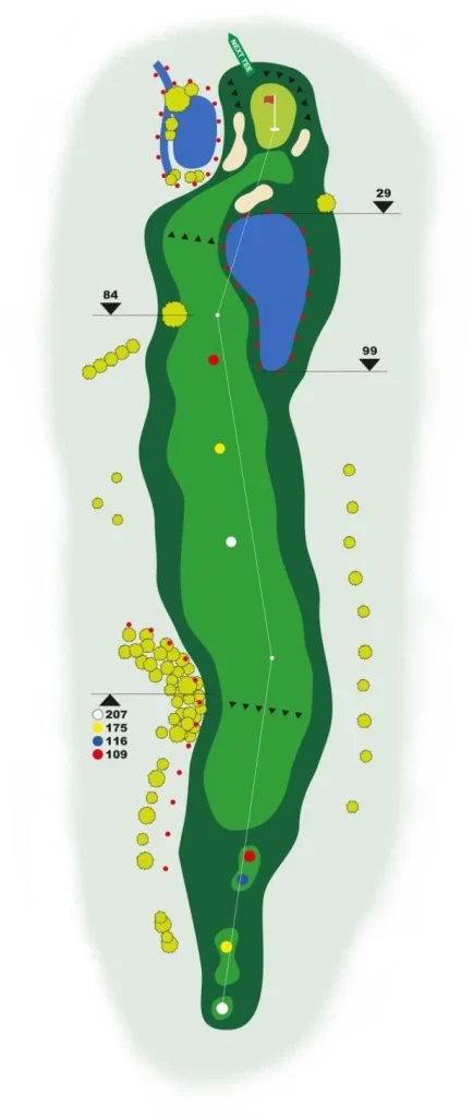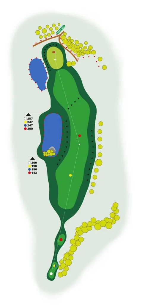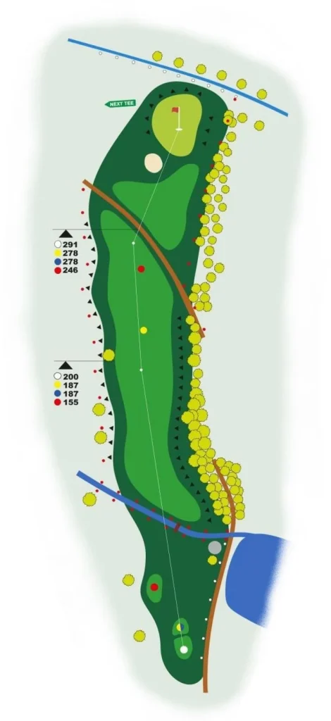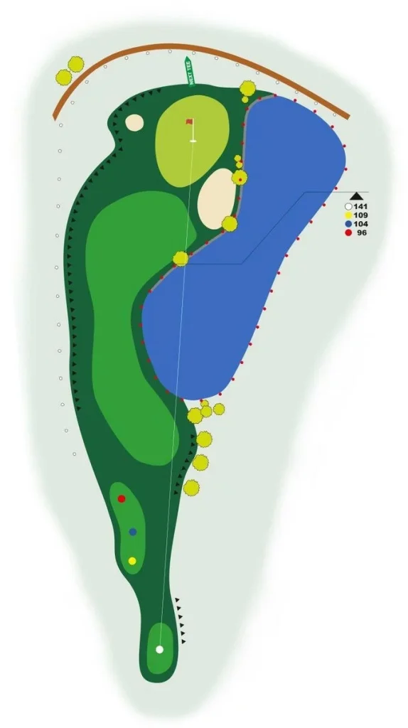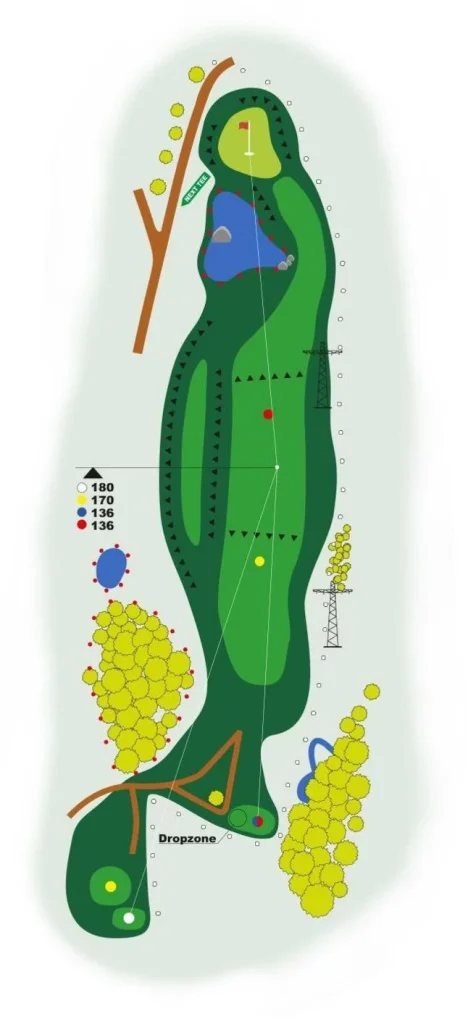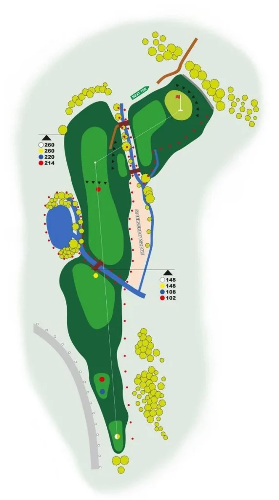 An diesem Par 5 kann mit konsequentem Spiel eine gute Birdie-Chance erarbeitet werden. Ein solider Abschlag Mitte Fairway sollte allemal reichen – nur die wenigsten werden mit dem zweiten Schlag das Wasserhindernis überschlagen oder gar das Grün erreichen können! Ein unkontrollierter Abschlag könnte hingegen das Out rechts oder die Baumreihe links des Fairways ins Spiel bringen.