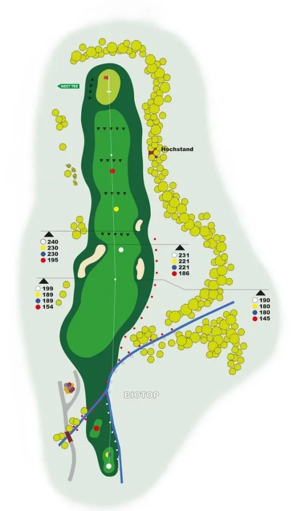 Das Grün ist vom Abschlag aus nicht einsehbar und von drei Seiten mit einer durchaus steilen Böschung begrenzt. Der sichere Abschlag zielt eher auf die rechte Grünhälfte – von der Böschung und dem Weg finden viele Bälle den Weg auf das Grün. Die linke Seite sollte gemieden werden. Zum einen sind die Bunker etwas tiefer, zum anderen neigt sich der Gegenhang oberhalb der linken Bunker in Richtung Out. Fehlschläge auf der linken Seite finden häufiger den Weg ins Out als rechts.