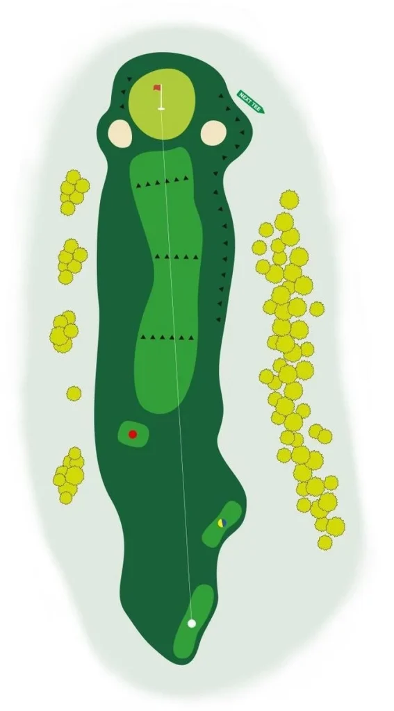 Das Fairway hängt speziell im unteren Bereich von rechts nach links und endet in einer kleinen Senke vor dem Grün. Zielen Sie eher auf die rechte Seite, speziell wenn Sie das Grün nicht mit einem „Carry“-Schuss in Angriff nehmen wollen.