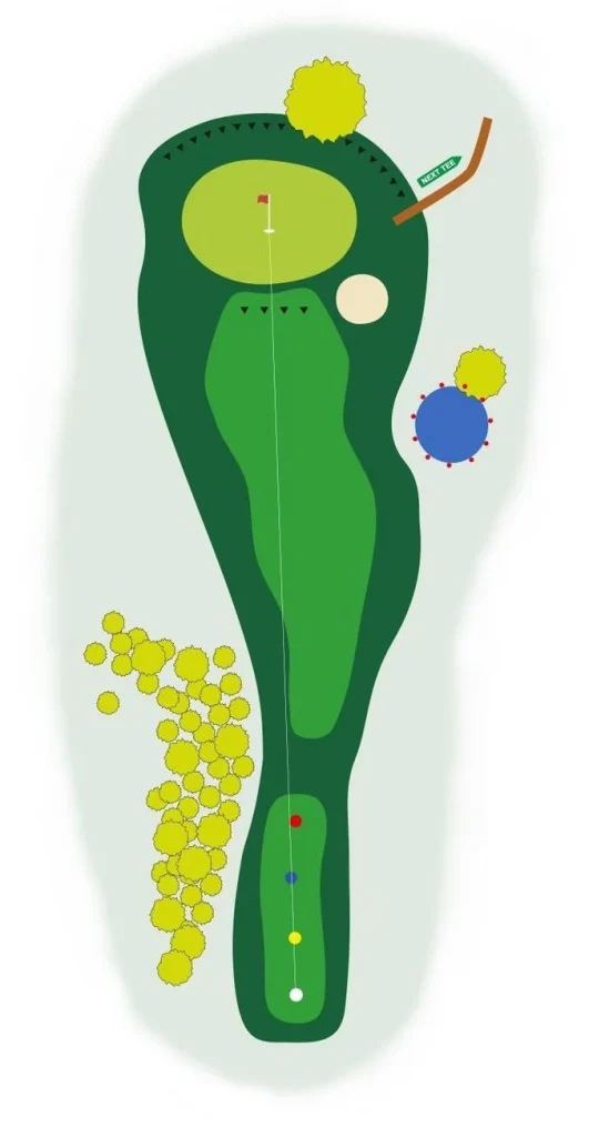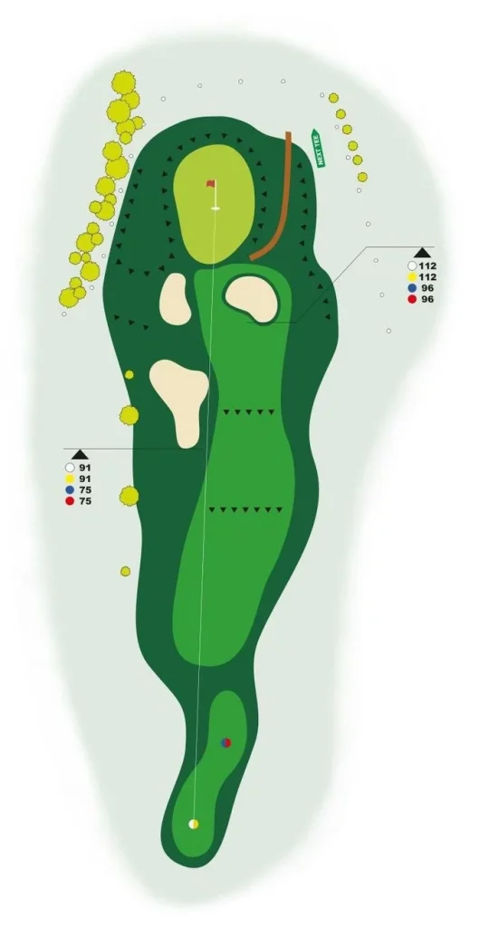 Der konservative Abschlag ist auf den linken Grün-Rand ausgerichtet. Der Hang links vom Grün lenkt Bälle in Richtung Grün ab. Zielen Sie bitte nicht zu weit links, denn die Straße links und hinter dem Grün ist „Out of Bounds“!