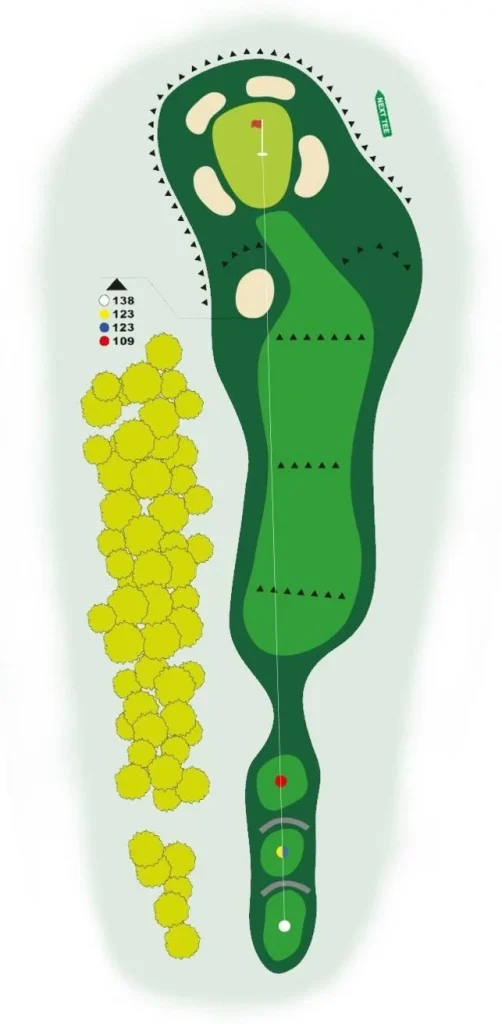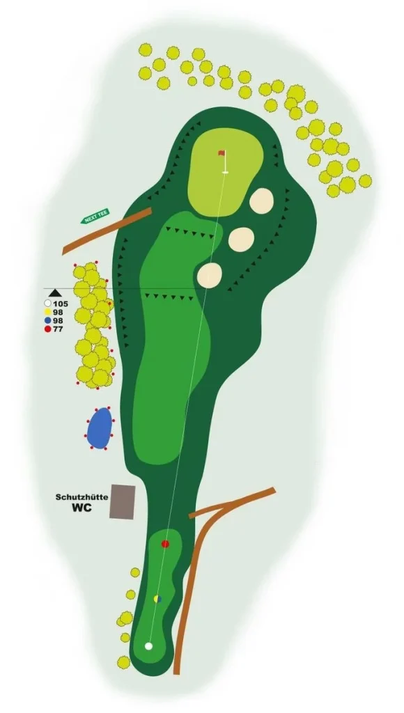Dem Grün sind mit etwas Abstand zwei Bunker vorgelagert. Ein sicherer Annäherungsschlag erfolgt auf die linke Seite, da sich das Grün zudem diagonal nach rechts hinten erstreckt. Das Grün ist nur schwach moduliert aber relativ groß und ein Drei-Putt ist somit keine Seltenheit!